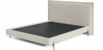 Cabeceira e base em madeira maciça de eucalipto tratado e MDF, revestidas com espuma D-16 e manta acrílica, com engate para facilitar a montagem. Estrado removível de madeira maciça, fechado em MDF e revestido em TNT, garantindo durabilidade ao colchão. Pés de ferro com feltro para proteção do piso. Acabamento disponível em várias cores e texturas.
