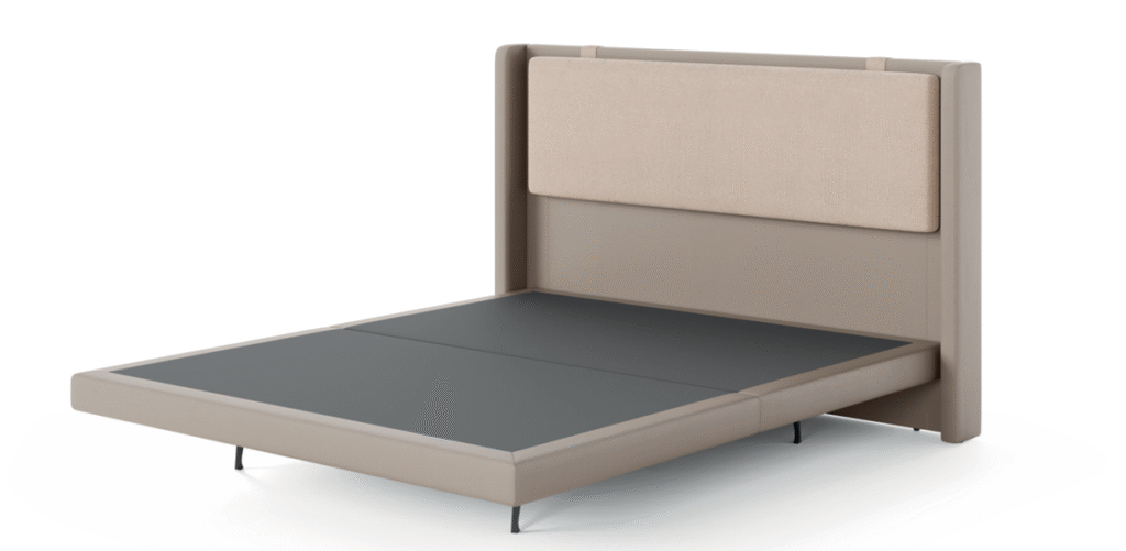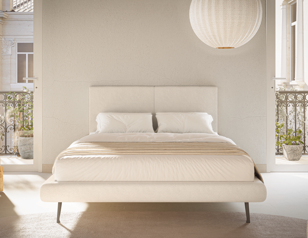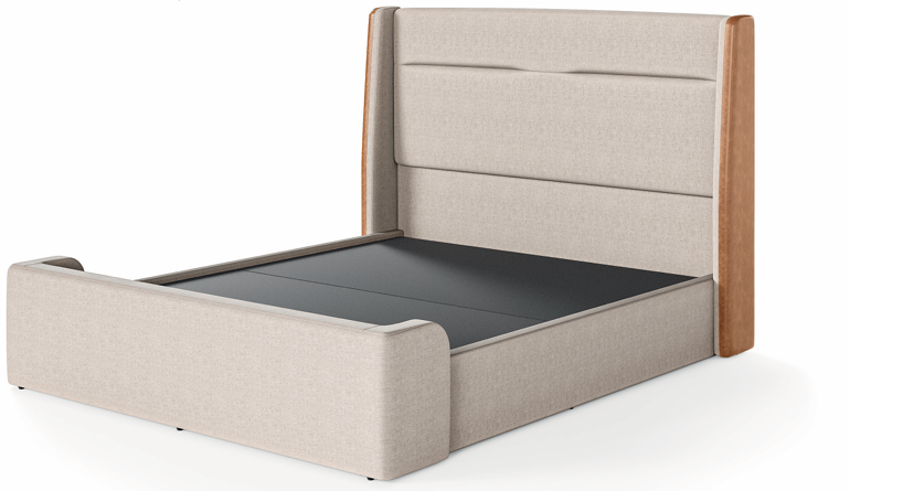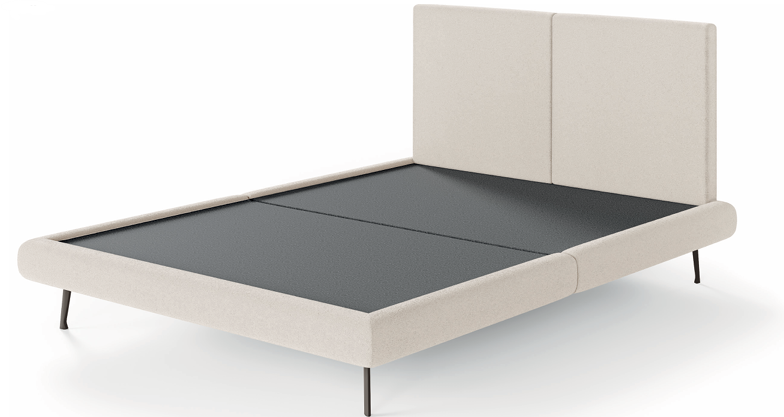 Cabeceira e base em madeira maciça de eucalipto tratado e MDF, revestidas com espuma D-16 e manta acrílica, com engate para facilitar a montagem. Estrado removível de madeira maciça, fechado em MDF e revestido em TNT, garantindo durabilidade ao colchão. Pés de ferro com feltro para proteção do piso. Acabamento disponível em várias cores e texturas.