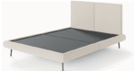 Estrutura em madeira maciça de eucalipto tratado e MDF, com cabeceira revestida em espuma D-23 e base revestida em espuma D-16 e manta acrílica para um acabamento superior. Estrado de madeira maciça, com fechamento em MDF e revestimento em TNT, proporcionando maior durabilidade ao colchão. Pés de ferro com feltro para proteção do piso. Acabamento disponível em várias cores e texturas.