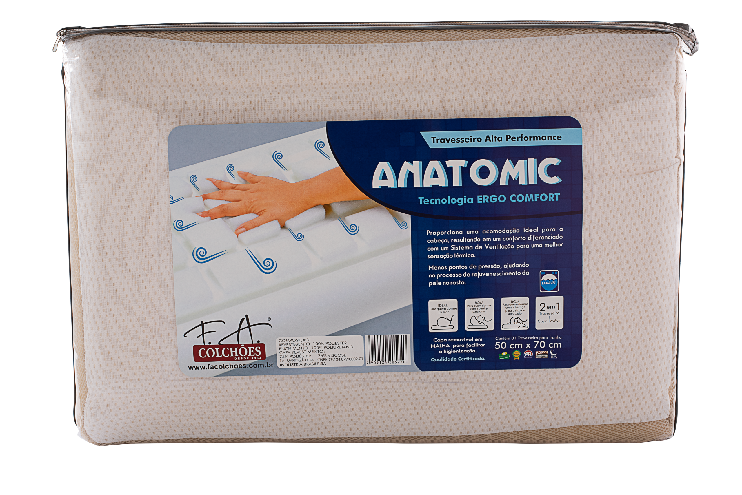 Tecnologia Ergo Comfort com o Travesseiro Anatomic Alta Performance. O Travesseiro Anatomic foi projetado para oferecer uma acomodação superior para a cabeça, resultando em um alinhamento perfeito e confortável. Seu grande diferencial é o Sistema de Ventilação, que garante uma sensação térmica agradável durante toda a noite. O design inteligente reduz os pontos de pressão, auxiliando até mesmo no processo de rejuvenescimento da pele no rosto. Versátil, ele é indicado para quem dorme de lado, de costas ou de bruços. A capa em malha é removível e lavável, facilitando a higiene.